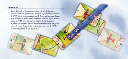 Wing of War — Famous AcesLes fous volants Avec Wings of War, plongez dans les premiers duels aériens à bord des coucous de la Première Guerre Mondiale. Battez vous en duel contre le Baron Rouge Le but du jeu est simple : abattre l'avion ennemi. Pour y parvenir, les joueurs choisissent simultanément trois cartes Manœuvre et les place sur leur plateau. Les cartes sont ensuite révélées une par une, et les déplacements sont résolus en même temps de manière simple : le joueur prend sa carte Manœuvre et la place devant son avion, qu'il prend alors pour le caler sur la flèche de sa carte Manœuvre. On regarde alors si un pilote peut tirer sur son adversaire. Pour cela, l'avion ennemi doit se situer dans son angle de tir et à portée (calculée avec une petite règle).