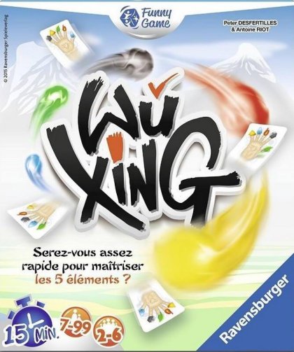 Chacune des cartes de Wu Xing comporte les cinq éléments représentés par un dessin et une couleur. L'idée directrice est de mettre en relation deux cartes dont 2 éléments sont placés à l'identique. Partant de là, quatre jeux sont proposés, du plus simple au plus complexe, selon qu'il faut prêter attention à une ou plusieurs cartes visibles. Si vous aimez jouer au célèbre Dobble ou au moins connu Flix Mix, vous devriez aimer Wu Xing.