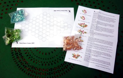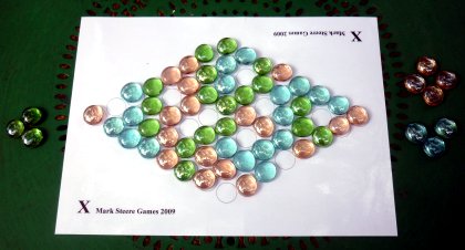 Mark Steere est probablement l'un des plus talentueux auteurs actuels de jeux stratégiques abstraits. X est un jeu de connexion étonnant, qui s'adresse exclusivement à trois joueurs. Le but est, accrochez-vous bien, de remporter le plus grand nombre unique de coins. Explications… Dans tout losange normalement constitué, il y a quatre coins. Lorsque trois joueurs se les partagent, quatre répartitions sont possibles : 4-0-0, 3-1-0, 2-1-1 et 2-2-0. Dans les trois premiers cas, on comprend aisément qui gagne puisqu'un joueur possède plus de coins que ses deux adversaires. Dans le dernier cas, le vainqueur est celui qui n'a remporté aucun coin, puisqu'il s'agit alors du plus grand nombre unique. Les adversaires, qui ont remporté deux coins, perdent : étant deux à marquer le même score, leurs résultats s'annulent. Comme dans tous les jeux de Mark Steere, il n'existe pas de partie nulle. L'auteur conseille de jouer sur un tablier d'assez grande dimension. Vous trouverez avec la traduction trois propositions de plans de jeu : 8 × 8, 10 × 10 et 14 × 14 cases.