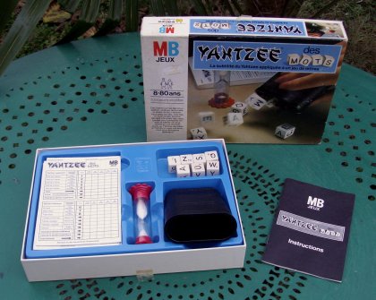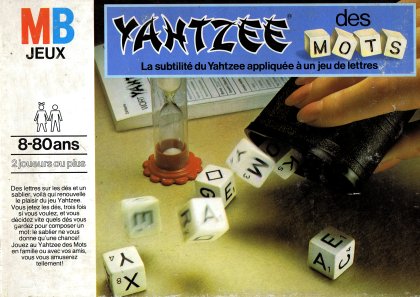 Yahtzee des mots nous propose de jouer au Yam’s avec des dés-lettres au lieu de dés classiques. Pas grand-chose à en dire, sinon que le jeu est plutôt moins intéressant que ses illustres aînés. L'éditeur, qui ne devait croire qu'à moitié au succès de son titre, n'a pas même pris la peine de faire une édition totalement francophone : trois lettres Ä, Ü et Ö, surmontées d'un tréma doivent, selon les règles, être considérées sans accent. De même, on découvre que le W ou le Y valent 4, le Z 10 et le S 2, ce qui démontre bien que le jeu n'a pas été totalement francisé. Pas rancunier, je l'accueille quand même dans ma collection.