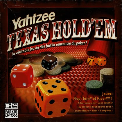 Vous aimez jouer au Texas Hold'em Poker mais malheureusement vous avez oublié de prendre un jeu de 52 cartes. Par chance, l'un d'entre vous a dans sa (grande) poche une boite de Yahtzee Texas Hold’em ! Les règles – que personne n'a osé signer – sont en gros celles du jeu de cartes, sauf qu'au lieu de cacher deux cartes, on cache deux dés sous un gobelet. L'intérêt, c'est que c'est beaucoup plus volumineux et que ça rapporte plus à l'éditeur qu'un simple jeu de cartes.