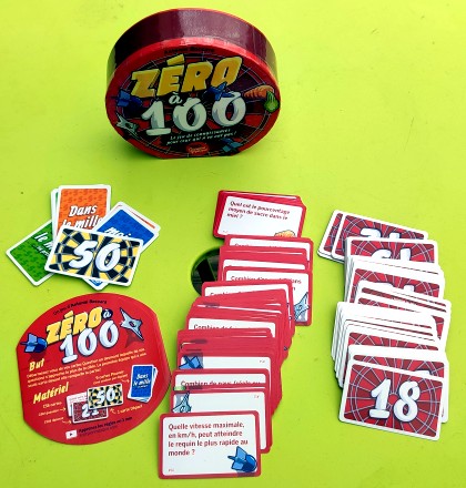 Zéro à 100 et Zéro à 1000 sont deux jeux astucieux créés par Antonin Boccara et basé sur les mêmes mécanismes. Il s'agit de se débarrasser des cartes posées devant soi en choisissant celle dont la réponse se rapproche le plus de la valeur de la cible visible au milieu de la table. Si, par exemple, la valeur de la cible cible est 58, il est recommandé de choisir, parmi vos cartes, celle où la proposition est "Le nombre de minutes dans une heure" plutôt que celle où la proposition est "Le nombre de colocataires de Blanche-Neige". Celui dont la réponse est la plus éloignée de la cible doit repiocher une carte tandis que tous les autres joueurs ont maintenant une carte de moins. Une nouvelle carte cible est placée et on recommence. Le premier qui n'a plus qu'une carte devant lui gagne la partie. Évidemment, les proposition imaginées par l'auteur sont moins attendues, et font tout le sel du jeu.