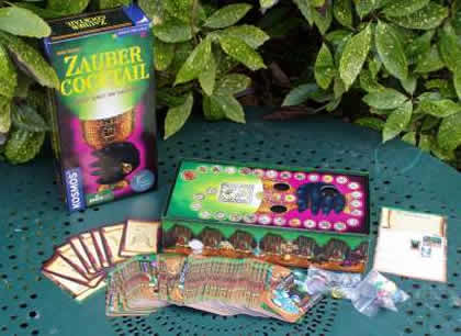 Zaubercocktail met en œuvre ce principe en l'agrémentant de règles un peu élaborées mais pas trop. Tout l'attrait du jeu vient des cartes aux noms imprononçables (Blauer Schlums, Grünwurz etc.). Certains tentent de remplacer les noms par des couleurs aux noms français. Il faut mettre immédiatement le holà à de telles pratiques. |
