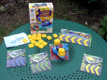 Si Zinzin l'avion est bien destiné aux jeunes joueurs, la qualité du matériel réussit parfois à convaincre les parents de jouer avec leur progéniture. Zinzin est un petit avion chargé de transporter des bagages d'une piste à une autre. On charge les valises sur ses ailes puis il s'agit de l'amener à bon (aéro)port. Le souci, c'est que plus on met de temps, plus l'avion se met à vibrer au risque de voir toutes les valises tomber au sol. Entre nous soit dit, il ne fait pas bon habiter à proximité des pistes fréquentées par notre ami Zinzin : le port du casque doit y être obligatoire. Le principal intérêt du jeu est dans l'imagination qu'il suscite pour la mise en place des pistes et le choix des obstacles : passer sous la table, franchir le canapé, faire deux fois le tour de maman, etc. Sympathique et amusant, Zinzin l'avion reprend un peu l'idée d'un jeu malheureusement introuvable : Le Parcours infernal. |