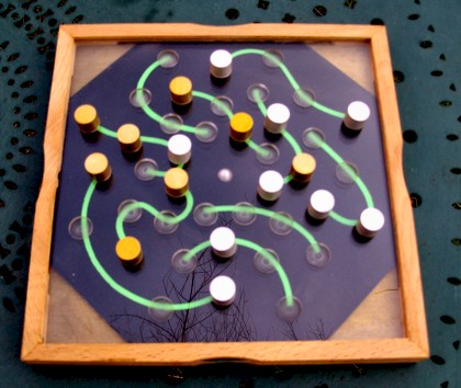 Les jeux de Pierre Berloquin sont rares. Le fameux ludographe est plutôt connu pour ses livres et rubriques récréatives. Je remercie donc mon amie Coline de m'avoir gentiment offert, pour mon Noël 2007, Zodiac qu'elle a dégotté au hasard d'un vide-greniers. Zodiac est un jeu d'alignement fort curieux. Il est composé de deux tabliers superposés : celui du dessus est transparent et fixe, tandis que celui du dessous pivote autour de son axe central. Les cases où jouer les pièces sont fixes, mais les traits définissant les alignements sont mobiles. Il s'agit donc d'un de ces jeux d'alignement difficile, mais aussi passionnant à jouer tant la vision est malaisée.