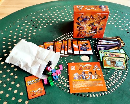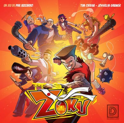 Zoku est un jeu de bagarre de gangs dont la principale originalité est la résolution des combats par des jets de meeples dans le couvercle de la boîte.