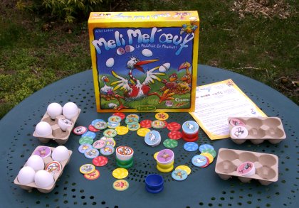 Meli Mel'œuf est un jeu de collecte rapide. C'est surtout le seul jeu qui, à ma connaissance, contienne un œuf de renard. Vingt moitiés d'œufs sont disséminées sur la table, face cachée. Chaque joueur possède en début de manche la moitié d'un œuf dans son coquetier. Les joueurs essayent de retrouver, avec une seule main, la moitié qui correspond à la leur. Lorsque l'œuf est reconstitué, il est mis dans son carton. Puis on retourne un autre demi-œuf et on part à nouveau à la chasse. Tout le monde joue en même temps dans un beau fouillis, mais avec une seule main (ce qui arrange bien ceux qui ont l'autre main dans le plâtre). Le premier qui réussit, au bout de plusieurs manches, à retrouver tous les volatiles gagne la partie. Mais les autres ne vont pas lui faciliter la tâche. Ils peuvent, par exemple, lui mettre dans son coquetier une moitié d'œuf qu'il a déjà récoltée ! Joyeux, interactif à souhait, théoriquement conçu pour les enfants… |