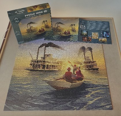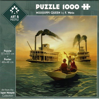 Puzzle - Mississippi Queen est un puzzle irrégulier de 1000 pièces qui représente l'illustration de couverture de la version Super Meeple de Mississippi Queen.