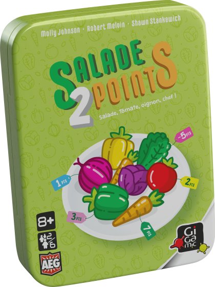 Les parties de Salade 2 points s'enchaînent sans jamais se ressembler. Les joueurs collectent à tour de rôle des contrats et des légumes en essayant de faire que tout cela s'accorde à la fin de la partie. Les 108 cartes contiennent sur une face l'un des 6 légumes et sur l'autre face un objectif. Parfois, cet objectif peut comporter des termes négatifs, par exemple + 2 points par tomate collectée en fin de partie mais – 1 point pour chaque carotte. On ne sait jamais à l'avance quels contrats vont apparaître et quand par hasard un contrat qui vous convient est révélé, vous n'êtes pas du tout certain de pouvoir le prendre lorsque votre tour viendra. La grande variété des contrats et le renouvellement des parties qui en découlent sont les points forts de ce petit jeu de cartes qui tient dans une poche et qu'on emportera volontiers dans les réunions de 6 personnes, le nombre idéal en période de pandémie