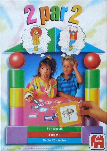 Toutes les cartes de 2 par 2 s'assemblent deux à deux. On joue avec la face bleue visible et il faut chercher les images associées comme par exemple un maillot de bains et une serviette de plage ou un peigne et une brosse à cheveux. Il ne faut pas réunir n'importe quelles cartes mais uniquement celles qui correspondent à la mission. Dans les exemples précédents, les missions sont des cartes représentant respectivement une piscine et une chevelure. Lorsqu'un joueur pense avoir trouvé les cartes répondant à la mission, il les retourne. S'il a vu juste, on retrouve au dos la même image que sur la carte de mission. Un intéressant jeu d'association d'idées pour les jeunes joueurs.