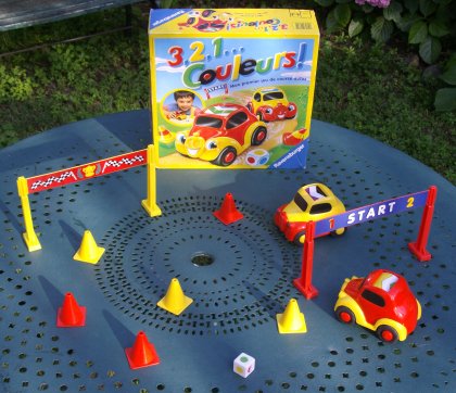 Les voitures contiennent une roue colorée. Quand la voiture avance, les couleurs changent. Et dès que la couleur du dé apparaît, il faut arrêter d'avancer la voiture. C'est magique ! Les parties durent de trois minutes à six heures selon la distance dont vous séparerez la ligne de départ de celle d'arrivée. 1998 : 3, 2, 1… Couleurs ! chez Ravensburger