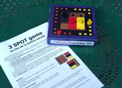 Créé par Edward de Bono, dans le même esprit que le L-Game, 3 SPOT game est un jeu qui se rapproche de la perfection minimaliste, à savoir un minimum de règles et de matériel. Ajoutez à cela une condition de victoire très originale et vous avez tous les ingrédients d'un jeu que vous devez impérativement acquérir ou fabriquer. Sur un tablier carré de 9 cases, 3 cases d'un même bord sont marquées d'un point (Spot). 6 cases sont recouvertes au départ par 3 pièces qui couvrent deux cases : une à la couleur de chaque joueur et une neutre. À tour de rôle, le joueur actif doit déplacer d'abord sa pièce, de sorte qu'elle ne soit pas au même endroit qu'avant (mais elle peut recouvrir une des deux cases initialement couvertes) puis il déplace la pièce neutre de la même façon. enfin, il marque autant de points que de Spots visibles. Pour gagner, il faut marquer 12 points, mais à condition que l'adversaire ait marqué au moins 6 points. Si l'adversaire a marqué moins de 6 points, celui qui atteint 12 perd ! Vaincre son adversaire sans l'écraser : cela explique peut-être pourquoi le nom original choisi par l'auteur était the “Social Justice Game” ! |