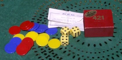 Faut-il présenter le 421 ? Bien que le hasard y soit important, le jeu comporte une part intéressante de décision, qui en fait l'un des précurseurs des jeux de prise de risque. Trois beaux dés en galalithe |