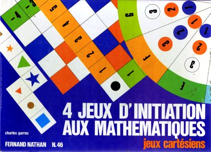 4 Jeux d’initiation aux mathématiques est typique d'une époque, au début des années 1970, où les maths modernes bouleversaient l'enseignement et la tête de nombreux élèves et parents. La boîte propose des jeux basés sur les ensembles et les coordonnées du plan. Pas sûr qu'on s'y amusait beaucoup.