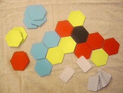 Le but est d'atteindre un objectif déterminé par une carte, soit de dessiner un ensemble de cinq pièces avec exactement quatre hexagones d'une même couleur et l'hexagone noir. Le principal intérêt tient dans le fait que les pièces n'appartiennent à personne en particulier. 6 × 5 est un dérivé de Xochintlan, du même auteur. On peut y jouer avec les pièces d'Exago. |