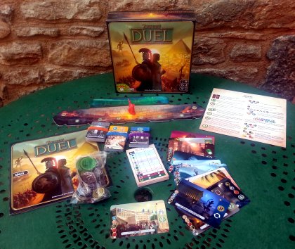 Adapter pour deux joueurs un jeu essentiellement basé sur l'interaction avec ses voisins de gauche et de droite et sur le partage progressif des cartes n'était pas facile. 7 Wonders Duel reprend surtout de son aîné 7 Wonders le principe du développement de civilisation au travers de pose de cartes et d'édification de merveilles. On retrouve bien l'esprit du jeu initial avec des spécificités intéressantes. Le système de pioche des cartes, dont la moitié reste secrète fonctionne très bien. Quand on choisit une carte, il faut tenir compte de ce qu'elle apporte mais aussi des nouvelles cartes auxquelles on va donner accès à son adversaire. La faculté de certaines merveilles qui permettent de rejouer peut s'avérer décisive. Il existe maintenant trois façons de gagner. La victoire militaire ou la victoire scientifique mettent immédiatement fin à la partie. Sinon, ce sont les points de victoire qui décideront du vainqueur. On rentre facilement dans le jeu qui peut cependant sembler répétitif si l'on y joue trop souvent. Mais je ne doute pas que les auteurs et éditeurs sauront nous proposer des extensions pour renouveler les parties.