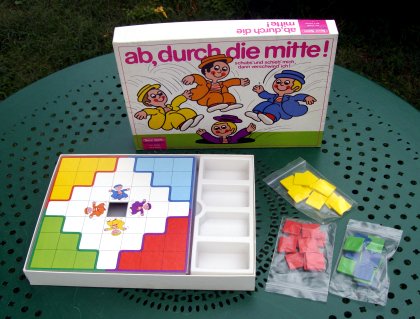 je traduirais personnellement par « Au trou ! » est un jeu de pions intéressant, pour deux ou quatre joueurs. Malheureusement, il est introuvable. Les plus bricoleurs d'entre vous peuvent cliquer sur l'image à droite, et ainsi télécharger un joli tablier de jeu à imprimer (ou à décalquer si vous n'avez pas d'imprimante).