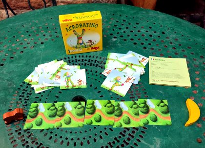 Acrobatino est un jeu coopératif pour très jeunes acrobates. Après avoir retourné deux cartes, tous les participants doivent faire se toucher les deux parties du corps indiqué, par exemple le genou avec la main (facile) ou le coude avec le cou (plus difficile !). Si aucun participant ne parvient à réaliser l'acrobatie, Bo le singe avance d'une des cinq cases vers la banane qu'il convoite.