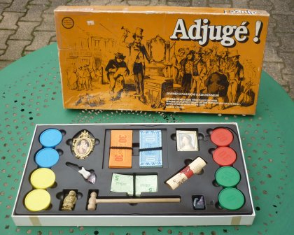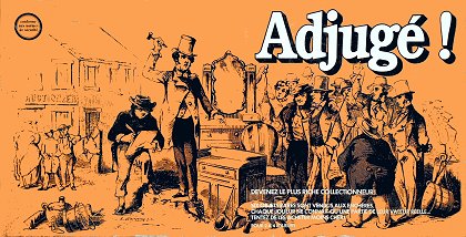 Il n'y a pas de hasard dans Adjugé ! mais beaucoup d'incertitude. La valeur de chaque objet mis en vente est en effet déterminée par l'ensemble des joueurs. Chacun dispose de six jetons, allant de « 10 » à « 100 », qu'il dispose sous les six objets en vente. Le prix d'un objet peut donc aller de la valeur du jeton qu'on a placé jusqu'à cette même valeur augmentée de cinq cents, en prenant pour hypothèse que tous les autres joueurs auraient placé leur jeton le plus élevé. On procède ensuite à des ventes aux enchères classiques. Les joueurs additionnent enfin la valeur réelle de l'objet avec l'argent qui leur reste en main. La mécanique, très simple, est assez redoutable. Adjugé !, pratiquement introuvable, peut facilement se jouer avec la règle, quelques cartes ou jetons marqués, les vases et bibelots de la tante Ursule, et de la monnaie prise dans le Monopoly du petit-frère.