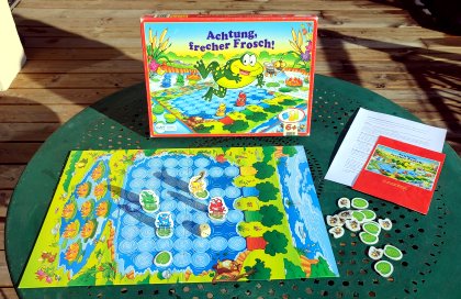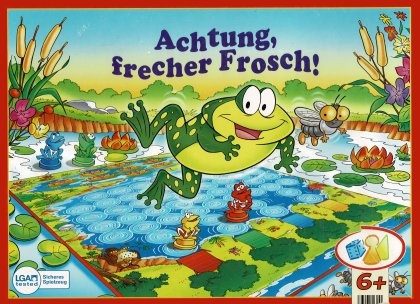 Achtung, frecher Frosch! (Attention, grenouille malicieuse !) oppose de deux à quatre joueurs (et leur grenouille) qui s'efforcent de capturer plus de mouches que leurs adversaires. Les grenouilles se déplacent selon le résultat du dé, en plaçant des feuilles sur la mare, jusqu'à atteindre les nénuphars où elles peuvent attraper une délicieuse mouche. Mais maintenant, il faut la ramener ! Et pour cela, éviter de croiser le chemin d'une grenouille à jeun qui serait tentée de capturer la mouche convoyée. Un jeu simple mais très interactif, où les jeunes joueurs apprennent que le chemin le plus court n'est pas nécessairement le plus sûr !
