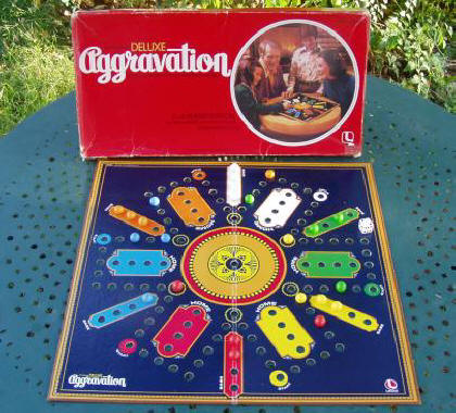 Aggravation est un dérivé du Ludo. La particularité du jeu tient essentiellement dans les raccourcis situés au centre du jeu. Une bille qui parvient sur une étoile - l'un des six points les plus proches du cercle, pourra utiliser au prochain tour le raccourci par les sommets. On peut même aller au centre, par un compte exact, ce qui fait gagner énormément de temps sur le parcours. Mais évidemment, on devient ainsi l'objet de toutes les convoitises…