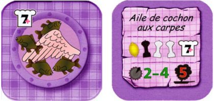 C'est une recette très difficile puisqu'elle exige, pour être réussie, exactement deux doses de sel ! La difficulté est cependant récompensée puisque l'aile de cochon aux carpes peut rapporter jusqu'à dix points ! Elle peut aussi faire perdre beaucoup de temps aux cuisiniers malhabiles. Mon conseil est donc de ne tenter de la préparer que si vous êtes déjà pas mal toqué. L'origine de cette tuile est une blague entre copains. Mes amis Pierre et Bilou, dont le fonds de jeux de société francophones est à ma connaissance le plus impressionnant au monde, ont pour emblème de leur collection un cochon ailé. Il m'a donc paru judicieux de composer, à leur intention, une nouvelle recette mettant en œuvre leur animal fétiche. C'est avec leur autorisation que je partage aujourd'hui avec tous les lecteurs de l'Escale à jeux cette mini-extension. Vous trouverez la tuile et sa règle dans les liens en début de présentation. |