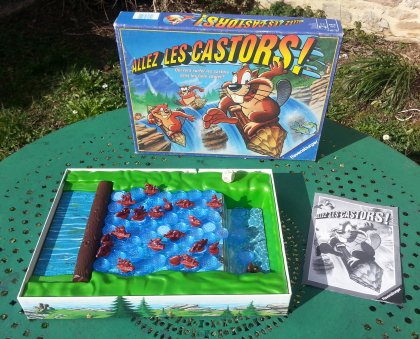 Allez les castors !, comme Thrill, est basé sur le principe du pousse pièce Le dé est composé de quatre faces « tu pousses » et de deux faces « tu pousses si tu veux ». Comme dans Thrill, le but est ici de faire tomber le moins de pièces possible. Plus exactement, il faut éviter de faire tomber des castors, la chute de vieilles bouteilles ou de godasses étant elle bénéfique tandis que les jetons vides n'ont pas de conséquence. Amusant…