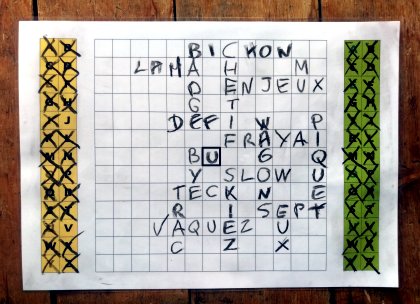 Une feuille de papier et un crayon suffisent pour jouer à Alphabet, pour peu que vous soyez expert en géométrie (il faut savoir tracer une grille de 13×13 cases) et en français (il faut savoir écrire toutes les lettres de l'alphabet sans en oublier aucune). Plutôt spécialiste des jeux de pions, Vincent Everaert fait une incursion réussie dans l'univers des jeux de lettres. Le premier joueur écrit une voyelle autre que Y dans la case centrale. Puis, à tour de rôle, chaque joueur doit écrire sur la grille un mot d'une longueur ne pouvant excéder celle du plus grand mot déjà écrit plus un. Les règles classiques des mots croisés s'appliquent et le mot tracé doit croiser un mot déjà écrit (une maçonnerie ou une extension ne suffisent pas). Toutes les lettres nouvellement écrites sont rayées par le joueur dans son abécédaire, mais pas celles qu'il a utilisées sans les écrire lui-même. Le premier joueur qui a utilisé ses 26 lettres remporte la partie. Il peut gaillardement ordonner à son adversaire : P O R T E Z C E V I E U X W H I S K Y A U J U G E B L O N D Q U I F U M E L'auteur recommande d'interdire les mots déjà utilisés lors de la partie ou des parties précédentes avec le même adversaire. C'est à notre avis une règle indispensable. Il faudra noter dans un petit carnet les mots utilisés, ce qui représente une dépense supplémentaire, mais au diable l'avarice ! Variante expertL'auteur propose aux experts la variante suivante. Avant de jouer, l'adversaire peut imposer l'utilisation d'une lettre qui n'a pas encore été rayée par le joueur actif. Il doit bien sûr être capable de proposer lui-même au moins une solution. Nous proposons même que celui qui impose une lettre soit en mesure de proposer au moins deux solutions avec la lettre imposée, qui ne soient pas de même radical. Variante de fin de partieIl arrive, entre joueurs retors, que la partie se bloque faute d'ouverture. L'auteur n'a pas prévu ce cas dans sa règle. Nous vous proposons de considérer que le gagnant soit le joueur qui ne peut pas jouer, ce qui oblige à toujours laisser une possibilité de jeu à son adversaire. Et si un joueur prétend ne pas pouvoir jouer et qu'une solution existe, il devient alors lui-même le perdant ! Jeu soloOn peut imaginer de jouer en solitaire. le but est alors d'utiliser les 26 lettres en le moins de tours possible.