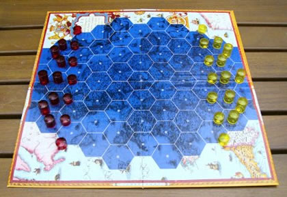 Certains jeux se pratiquent sur des cases, d'autres sur des intersections. Armada se pratique sur les deux : deux types de pièces se déplacent sur les intersections et un type de pièce se déplace de case en case. À part ça, bon ben… c'est un jeu de pions et d'affrontement, quoi. |