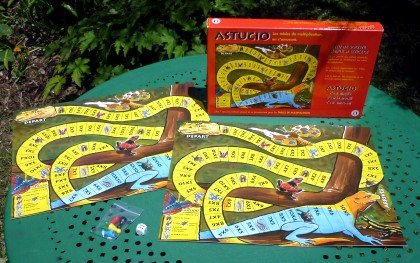 Astucio, « les tables de multiplication en s'amusant », nous dit le sous-titre. Effectivement, on rit beaucoup ! Après avoir lancé le dé, on avance du nombre de cases indiqué, et on arrive sur une case. Soit c'est un animal, et on se réfère à l'instruction (reculer, passer un tour, etc.). Soit c'est une multiplication, et il faut en donner le résultat pour pouvoir rester sur la case. La pénalité en cas de mauvaise réponse est le retour à la case précédente. On s'amuse, on rigole !