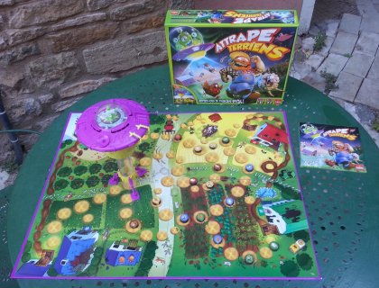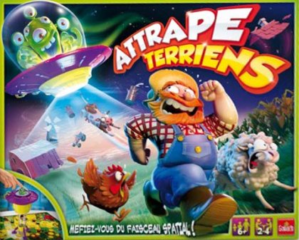 Vous aimez les jeux décalés ? Vous avez apprécié le thème de Terra Galactix où le joueurs interprètent des aliens attaquant la terre ? Vous devriez apprécier Attrape Terriens où les joueurs animent à la fois les terriens qui tentent de survivre à une attaque alien, et les aliens qui tentent de les « sucer » à l'aide d'une étonnante soucoupe-aspirateur. Les terriens, fermiers et animaux de la ferme, sont représentés par des petits pions en mousse. L'envahisseur promène sa soucoupe à la poursuite des terriens et, lorsqu'il parvient à les rattraper, déclenche un petit aspirateur : on voit alors le pion en mousse s'envoler délicatement pour rejoindre le vaisseau spatial. Heureusement, il existe un refuge : les toilettes de jardin. mais un seul terrien peut y séjourner. On est clairement dans le jeu familial. On peut laisser son cerveau à l'entrée et se laisser aller à rigoler pendant une demi-heure. Chez nous, on adore !