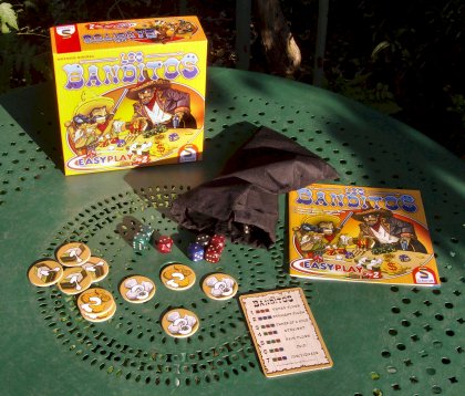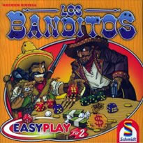 Lors du premier tour, les deux premiers joueurs commencent par tirer et jeter un seul dé. À partir du troisième joueur, on tire et on jette normalement les deux dés. Lorsqu'une levée est revendiquée ou abandonnée, le vainqueur prend le billet puis on remplace ce billet par le premier de la pile, donc dans l'ordre : 1, 3, 3, 3, 5 et 5 pesos. Il s'agit donc de ne pas revendiquer ou abandonner le premier pour éviter ce méchant billet de 1 peso. Le vainqueur est le premier joueur qui atteint 10 pesos. Si, en fin de partie, un joueur ne dispose plus que d'un emplacement, il ne tire qu'un dé. Si tous ses emplacements sont occupés, il attend la fin de la partie en se rongeant les ongles. ConclusionSi le problème évoqué de fin de partie est bien embêtant, il l'est moins lorsqu'on en a pris connaissance, et qu'on a décidé dès le début quelle règle on jouait. Il n'en reste pas moins que Los Banditos est un jeu vraiment agréable. Je lui attribue donc sans vergogne deux |