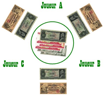 Variante pour trois joueursCette variante est bien sûr largement inspirées par la variante pour trois joueurs de Schotten-Totten, publiée dans le magazine Jeux en boîte. Il vous faut vous munir de deux boîtes de jeux, et des billets préalablement imprimés et séchés. Mettez dans le sac trente-six dés, soit neuf de chaque couleur. Les billets ne sont pas mélangés. Ils sont disposés, face visible, comme sur le schéma ci-dessous, avec au centre la réserve.