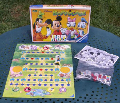 Vous reconnaissez ce jeu ? Il s'agit en effet d'une copie du fameux Barricade, réalisée pour un jeu publicitaire. Le nom de l'auteur et du jeu original ne sont cités à aucun moment. La seule modification est l'extension à six joueurs, qui crée un déséquilibre évident en défaveur des deux joueurs verts et noirs. Bref, une mauvaise copie. 1995 : Disney BarricadeCette version Disney (il y en a eu plusieurs) ne propose que deux pions par joueur. Les joueurs sont Mickey, Pluto, Donald et Daisy. La parité n'était pas encore à l'ordre du jour. 2005 : Barricade dans la collection « Classics »Barricade est maintenant proposée dans la version « Ravensburger Classics », par :