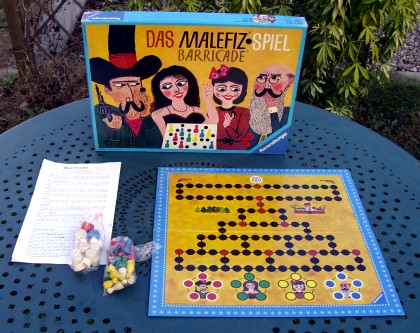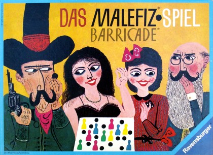Disparu du catalogue de Ravensburger en France, Barricade est un jeu très ancien, qui reste très vendu outre-Rhin et outre-Quiévrain, parfois sous le nom Malefiz. Le principe est très simple : amener l'un de ses cinq pions en haut du plan de jeu, sur la case finale. Les pions adverses bloquent la passage, mais on peut les expulser. D'autre part, des barricades bloquent certaines portions du parcours. En tombant exactement dessus, on peut les enlever et les reposer où on le désire : derrière soi, pour empêcher le passage des poursuivants, ou devant un pion adverse.