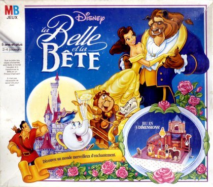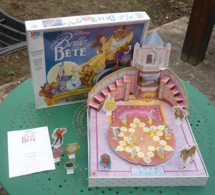 La Belle et la Bête est un jeu à monter en carton, une spécialité MB. Le but est de trouver qui est le plus résistant entre le matériel, et l'enfant auquel il est destiné. Et c'est toujours l'enfant qui gagne ! Dans le cas présent, il m'a fallu trois boîtes achetées sur des vide-greniers, pour parvenir à reconstituer un jeu complet et en assez bon état.