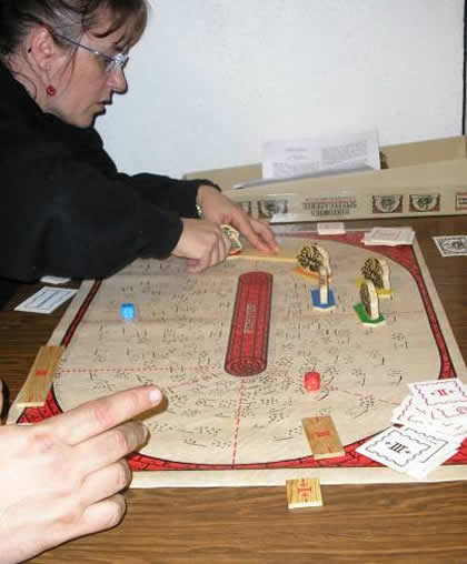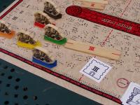 La façon de jouer est très intéressante, d'autant plus que le tapis en skaï légèrement mou donne une adhérence exceptionnelle aux pièces. Les règles de base donnant une part trop importante au hasard, j'ai réessayé de jouer avec des règles légèrement adaptées. C'est mieux, mais ce n'est pas encore idéal. Le vainqueur a certes bien joué, mais il a aussi eu beaucoup de chance dans ses tirages de cartes.