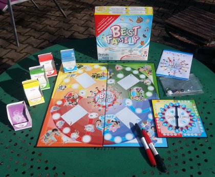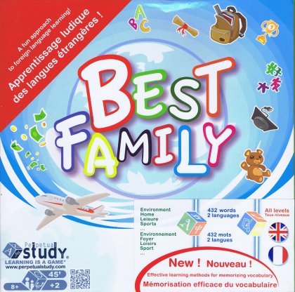 Dans la famille des jeux didactiques, Best Family ne détonne pas. Il s'agit d'un jeu de vocabulaire français/anglais somme toute classique, qui a pour bonne idée de permettre à chacun de jouer selon son niveau : les débutants auront à traduire a star, hair, mirror ou encore a present tandis que, trois niveaux au-dessus, les anglicistes chevronnés se débattront avec hurdles, a curler, a stub ou a clutch. On s'étonnera toutefois de la présence de nombreux mots transparents dans les différents niveaux (asymmetric bars, the bobsleigh, cardiology, Central African Republic…) Un autre bon point réside dans la possibilité de jouer en choisissant son sens de traduction. Chacun fait progresser son pion sur le tableau en fonction de ses bonnes réponses et du nombre de cases indiqué par la flèche mobile, qui désigne par ailleurs le mode de réponse : par prononciation, épellation ou écriture (avec de beaux stylos effaçables). Les éventuels coups de chance à répétition sont contrôlés par des cases-étapes, que l'on ne peut franchir qu'après avoir atteint un score prédéfini par les joueurs. Des cases « Challenge » ajoutent un brin de chaos, à la manière des cartes « Chance ? » du Monopoly. Reconnaissons-le : le jeu avoisine un indice ludique proche de celui d'une visite chez le dentiste. Il sera d'autant plus désagréable qu'en l'absence de maîtrise suffisante du vocabulaire, les joueurs (en particulier les jeunes pour lesquels le niveau débutant s'avèrera trop élevé) sècheront lamentablement. Heureusement, les auteurs ont prévu le coup et nous suggèrent d'inventer nos propres règles du jeu. Voici donc une adaptation qui aidera tout le monde à démarrer : ne pas démarrer avec un paquet complet d'un niveau donné, mais seulement avec une dizaine de cartes, que l'on passera en revue avant de commencer. Lors de chaque réponse exacte, une nouvelle carte, vue par tous, sera ajoutée au paquet, qui sera brassé. Chacun ne sera donc interrogé que sur des mots qu'il aura eu la possibilité de mémoriser auparavant. Le but, après tout, n'est pas ici de passer une soirée de folie, mais d'élargir son vocabulaire anglais… Best Family est à même de remplir cette mission.