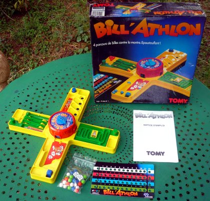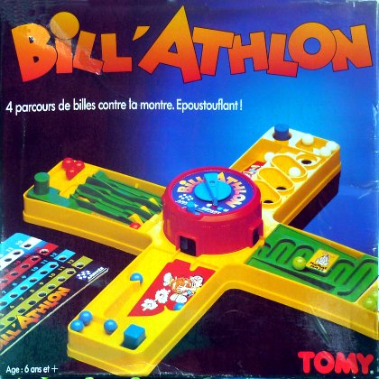 À partir de petits casse-tête de type labyrinthe à bille, Tomy nous propose un amusant jeu de course par étapes. Les joueurs qui s'affrontent à Bill’Athlon doivent amener le plus de billes au centre, dans quatre épreuves successives. L'ambiance est au rendez-vous, et les mécanismes résistent bien aux années, et aux furieux qui passent.
