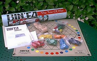La lecture de la règle, écrite sous forme de questions et de réponses donne tout de suite envie de jouer. Bin’Fa mélange curieusement hasard et stratégie, et on a hâte de voir ce que cela donne. Autant le dire tout de suite : j'ai été très agréablement surpris. L'auteur a parfaitement réussi son pari : simuler une charge de cavalerie. À la tête de votre petite armée de douze pions, vous tentez d'être le dernier survivant. Pour cela, il faut bousculer les adversaires, et les éliminer en les étouffant. Chaque mouvement coûte des provisions dont il faut également gérer le stock. Pour se réapprovisionner, il faut y consacrer un ou plusieurs tours pendant lesquels on ne bouge pas.