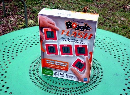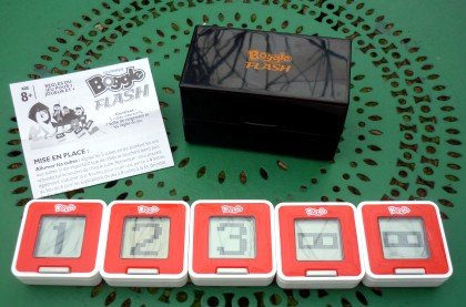 Quand on fait des anagrammes avec des lettres, on tripote ses jetons ou on mélange les cartes qu'on a en main. Cette méthode est naturelle, au contraire de celle qui consiste à cliquer avec une souris ou à tapoter sur un clavier. Boggle Flash s'est donc adapté à nos habitudes ludiques en mettant l'électronique au service du jeu de société. Cinq « pico-ordinateurs » affichent des lettres avec lesquelles nous devons composer des mots de trois à cinq lettres. Lorsqu'on en trouve un, il suffit de bouger les cubes pour les aligner convenablement. C'est alors que la fée électricité agite sa baguette magique : si le mot est accepté, nous sommes récompensés par un « bip » et un clignotement des cubes. Bien sûr, il est préférable d'être amateur de jeux de lettres. Si c'est le cas, l'objet va rapidement devenir indispensable, d'autant plus que l'éditeur a eu l'excellente idée de fournir une petite boîte qui contient tous les éléments pour jouer, et qui peut se transporter dans la poche. Réellement génial !