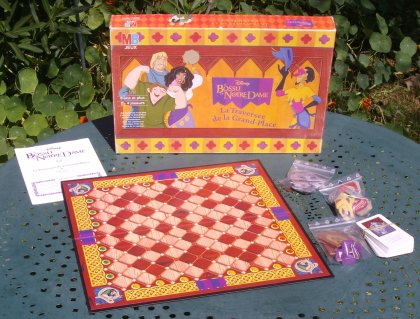 Le Bossu de Notre-Dame - La Traversée de la Grand-Place est un jeu de course plaqué sur le thème du dessin animé de Walt Disney. Chacun essaye d'arriver le premier de l'autre côté de la place. Pour progresser, les joueurs choisissent l'une des deux cartes qu'ils ont en main, puis en tirent une nouvelle. Quelques cases portent un carton. Quand on arrive sur dessus, on le révèle et on applique sa directive, bonne ou mauvaise. Le système utilisé dans Le Bossu de Notre-Dame - La Traversée de la Grand-Place est assez intéressant, mêlant tactique et hasard. Un joueur peut toujours éviter le hasard, s'il le souhaite, mais n'est-ce pas aussi un peu l'âme du jeu ? |