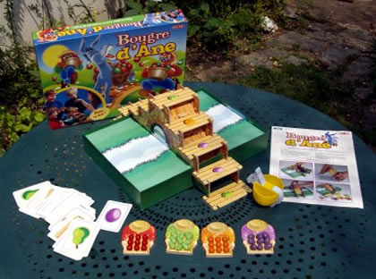 Bougre d'Âne est d'abord un jeu séduisant par son matériel : de jolis fruits en bois, un astucieux escalier utilisant toute la boîte, et de belles cartes illustrées. On aurait aimé que les paniers de l'âne soient en osier, mais bon… on pardonne cette légère faute de goût.