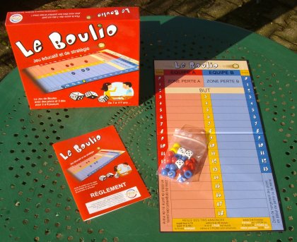 Créé par un passionné de Boule lyonnaise, Le Boulio est un jeu de hasard raisonné, dans lequel la chance tient une bien plus grande part que dans le jeu réel… sauf quand c'est moi qui y joue. On joue au Boulio en jetant trois dés mais le reste des règles, qui sont variées et expliquées en détail dans le petit livret, s'apparente au vrai jeu sportif. Il faut donc, par exemple, annoncer à l'avance si l'on va tirer ou pointer. Le Boulio est un instrument parfait pour comprendre les règles du meilleur sport de boules (en existe-t-il d'ailleurs d'autres ?), puisque lyonnais L'ambiance du jeu, parfait pour jouer sur un coin de comptoir, avant ou après une rencontre sportive, est bien présente. Et si vous êtes allergique aux jeux de hasard, rien ne vous empêche de concocter une ou deux variantes, qui feront plus appel à la décision. |