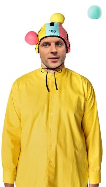 La boîte contient deux bonnets munis de scratchs et 3 boules en tissu feutré. Aucune règle du jeu n'est fournie, on est censé comprendre comment jouer avec l'illustration de la boîte. En gros, vous choisissez un gus qui a une grosse tête, vous lui enfilez le casque à scratchs et vous essayez de marquer un maximum de points en lui lançant des boules de sorte qu'elles s'accrochent et rapportent des points.