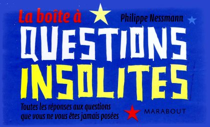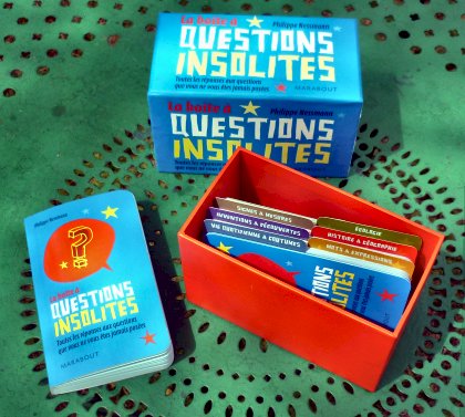 La Boîte à questions insolites n'usurpe pas son titre. On y trouve quatre-vingts questions toutes curieuses, classées en six catégories : vie quotidienne et coutumes, mots et expressions, inventions et découvertes, histoire et géographie, signes et mesure et enfin écologie. Un épais livret contient les réponses très complètes. Quelques exemples de questions :