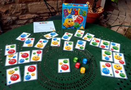Bubbles est un jeu de rapidité et d'observation. Chaque carte montre quatre bulles de colorées de tailles différentes. Toutes les combinaisons sont présentes et il n'existe pas deux cartes présentant le même ordre. Quatre dés de couleurs présentent sur leurs faces toutes les valeurs de 1 à 24. Un joueur lance les quatre dés qui vont donc présenter quatre valeurs différentes. Il faut alors être le plus rapide à saisir la carte dont les bulles sont classées en taille croissante comme les quatre dés sur la table. Dans l'exemple suivant, il faut donc trouver la carte où la bulle bleu est la plus petite, puis la bulle jaune, puis la verte et enfin la rouge.
