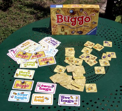 Certes, Buggo est entièrement en anglais. Mais il suffit en fait de connaître cinq mots : one, two, three, four et five. Ou alors de savoir compter sur les doigts d'une main. Buggo met en jeu à la fois la mémoire et la prise de risque. Les tuiles sont toutes retournées sur la table face cachée, et on pioche une carte. Le nombre qui apparaît est le nombre à ne pas dépasser. On retourne alors les tuiles une à une pour trouver des insectes. Le but est de récupérer le plus de cartes possible, mais si l'on dépasse le nombre maximum autorisé, il faut remettre à l'envers toutes celles qu'on a piochées à ce tour. Simple et de bon goût, Buggo est une excellente initiation à la prise de risque. |