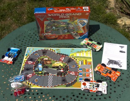 Cars 2 World Grand Prix est une classique course de voitures régie par des dés. Chacun possède deux éléments de jeu : une voiture montées sur un socle qui est son pion et une grande boîte de vitesse en forme de voiture également qui permet de gérer ses rapports et donc d'utiliser plus ou moins de dés. En cas d'incident ou d'accident, on perd une roue. Curieusement, la course continue tant qu'on possède encore au moins une de nos quatre roues ! Quand on perd la dernière roue, on s'arrête au bord de la route et l'atelier, gentiment, nous apporte quatre nouvelles roues. Le matériel est médiocre et la boîte de vitesse s'abîme très rapidement. Un jeu dispensable.
