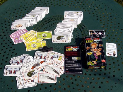 Ca$h’n Gun$ Live est donc bienvenu pour les weekends ou les réunions ludiques. La règle est facilement assimilée et si le meneur de jeu la connaît bien, il peut lancer une partie en quelques minutes. On retrouve l'ambiance et l'intrigue de Cash’n Guns : des gangsters sont réunis pour partager un magot, ils ne sont pas d'accord sur ce partage et usent d'arguments qu'ils maîtrisent, à savoir leurs armes. La nouveauté, c'est qu'on joue debout, dans un espace approprié où l'on va se déplacer selon l'arme que l'on possède ou que l'on redoute. Il est, par exemple, mal venu de se trouver à côté d'un collègue visé par une grenade… Bonne nouvelle : un joueur n'est pas éliminé : quand il est touché, il passe simplement son prochain tour à l'hôpital. |